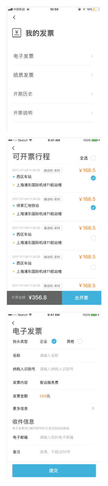 根据2016 年11 月实施的《网络预约出租汽车经营服务管理暂行办法》第二十条,约车平台公司应当合理确定网约车运价,实行明码标价,并向乘客提供相应的出租汽车发票。在无纸化办公成为趋势的今天,尊龙凯时出行新增的电子发票功能不仅提升了开具发票的安全性与时效性,还为低碳、环保做出了贡献,贴合了平台智慧可持续的品牌理念。